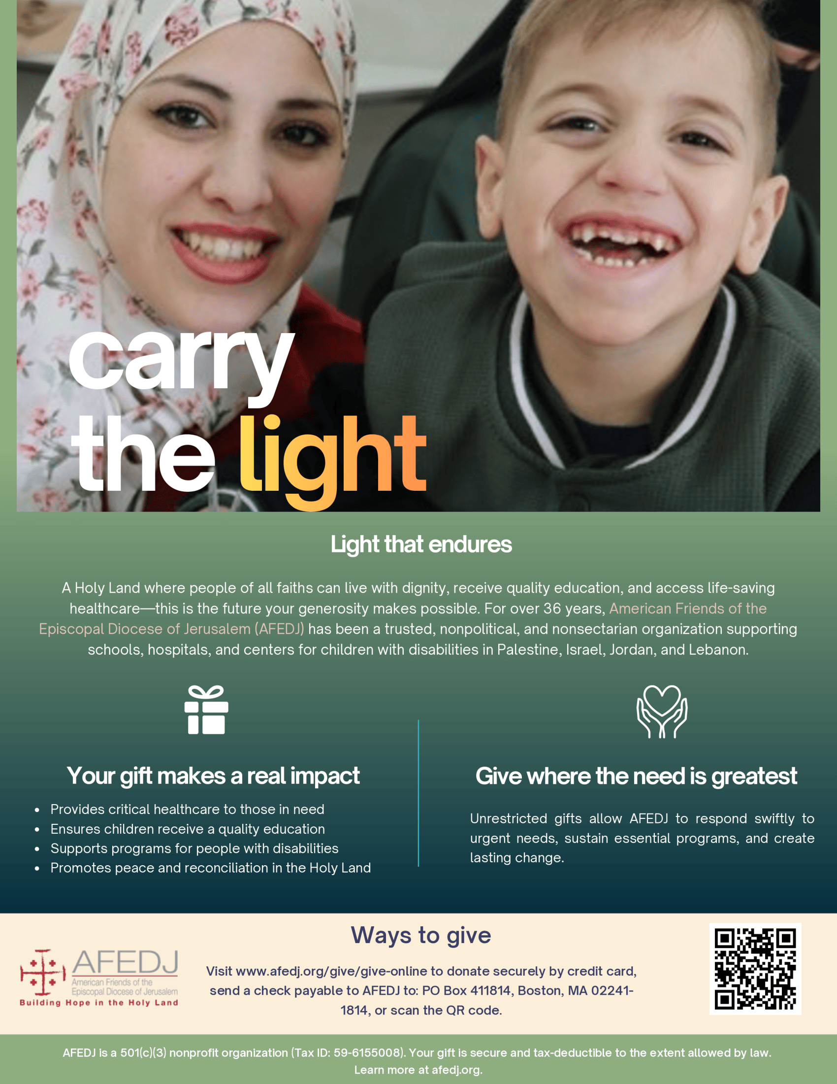 Download this printable 2026 AFEDJ fundraising flyer to share with your community throughout spring and summer, inviting them to make a difference in the Holy Land.